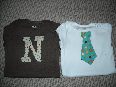 Also tonight I did some more applique's. I love, love, love the N for Noah on the brown onesie. I had bought a set of dark colored onesies for this winter and when I saw this dotted fabric I fell in love and thought it would look great with brown. And the tie one, I had to redo since I messed it up the other day so here is another (I decided to do new fabric that I got this week instead). Tomorrow I am going to get some embroidery thread and try to hand stitch around these (I think) instead of doing the machine this time. I saw one online like that and thought it was cute with thick thread.